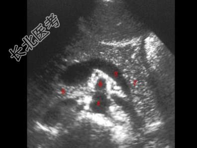 - 超声发现肝门区纺锤形无回声与门静脉相通,