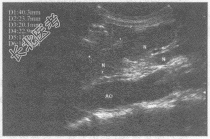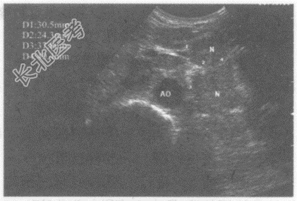超声综合描述: 腹主动脉前方可见多个大小不等低回声,最大4.0cm×2.3cm, 边界尚清晰,形态不规则, 部分相互融合。