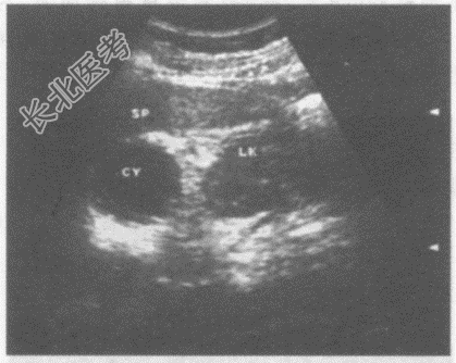 超声综合描述: 左肾上极与脾之间可见3.4cm×4.0cm圆形无回声区,包膜完整, 后方声加强,CDFI: 内未见动静脉血流信号。