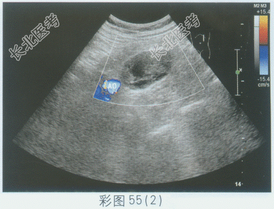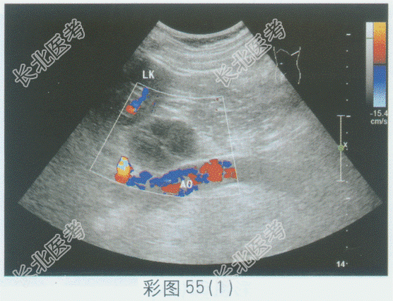超声综合描述: 左肾下极与腹主动脉之间可见不均质低回声,与腹主动脉关系密切, 边界清晰,形态规则, 内可见形态不规则无回声,CDFI: 其内及周边均未见动静脉血流信号。见下图及彩图55。
