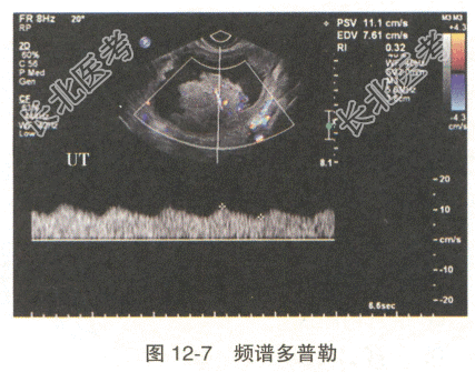 - 多项选择题3.经阴道超声检查示子宫增大,宫腔线分离, 宫腔内见不规则低回声,内部回声不均, 与子宫后壁肌层分界不清(图12-6),CDFI: 内部见较丰富血流信号,频谱为低阻血流, RI:0.32(图12-7)。最可能的诊断是