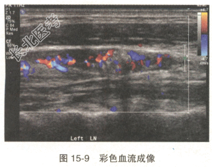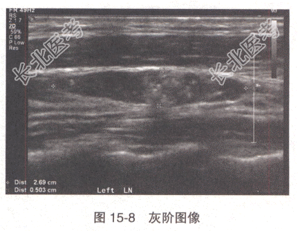 患者,女性,45岁。左颈部触及结节来诊。超声检查示左颈中部见一淋巴结,其声像图表现见图15-8、图15-9。