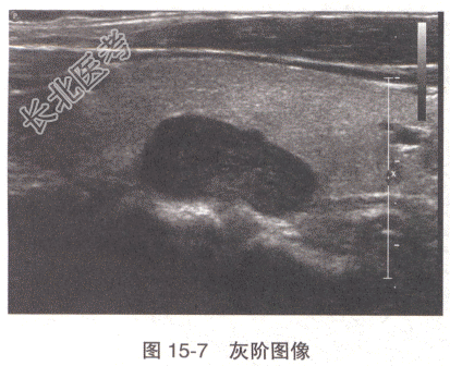 - 多项选择题2.[提示]患者超声检查发现甲状腺右叶中部背侧有一2.1cm×1.1cm低回声,边界清晰, 内见少许无回声,彩超其内见丰富血流(图15-7)。结合病史, 最可能的诊断是