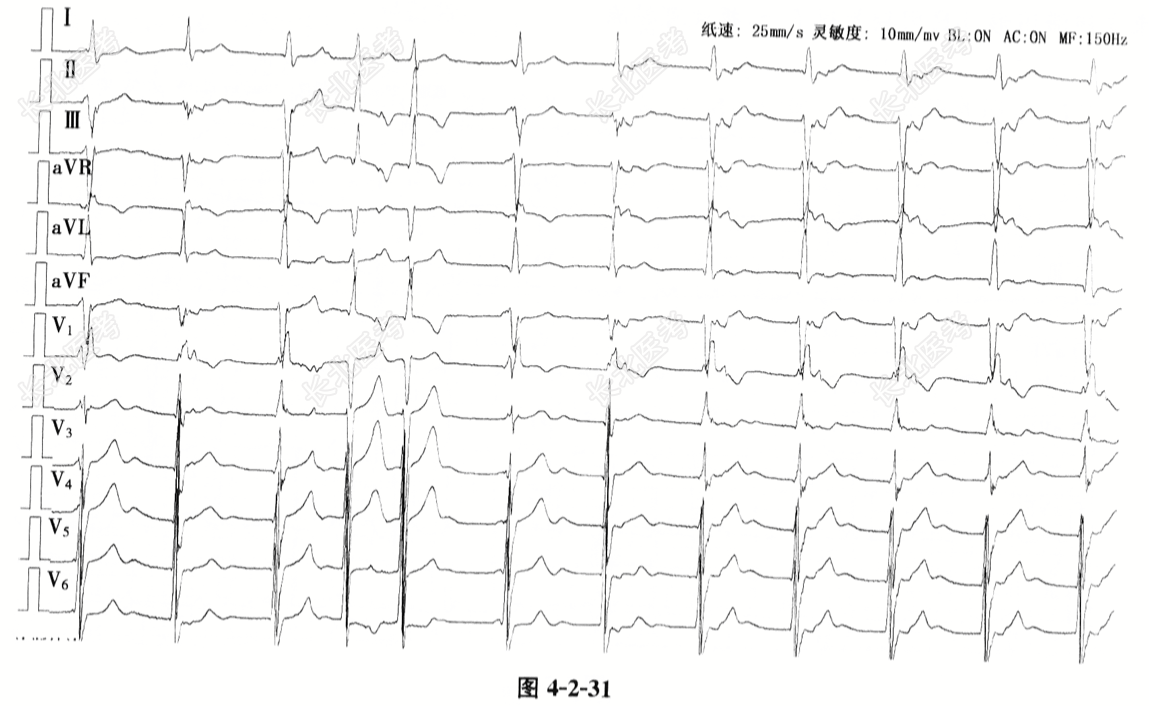 - 单项选择题患者,男, 75岁,临床诊断为老年退行性心脏病, 主动脉瓣重度关闭不全,心功能3级。心电图见图4-2-31, 准确而完整的诊断应为