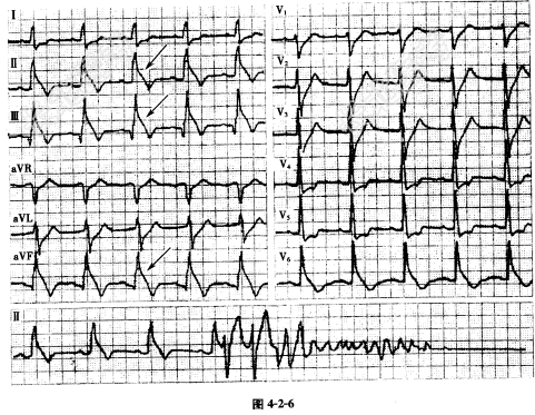 - 单项选择题Ⅱ、Ⅲ、aVF导联ST段呈下斜型抬高并缓慢下降,其后T波倒置, 心电图如图4-2-6所示,该特殊波称作