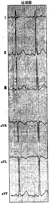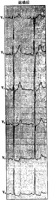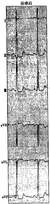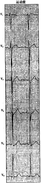 单项选择题患者,男, 47岁,发作性胸痛, 临床考虑为冠心病。行运动试验检查,运动中患者出现胸骨后压榨样疼痛。运动前、运动中及运动后4分钟的心电图见下图。运动试验结果应为