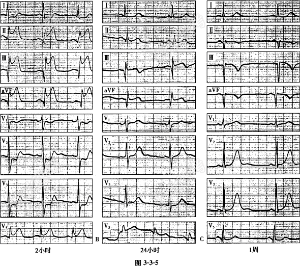 - 单项选择题患者,男, 47岁,因突发胸痛2小时就诊。图3-3-5A、B、C系患者胸痛发作后2小时、24小时及1周的心电图记录, 应诊断为