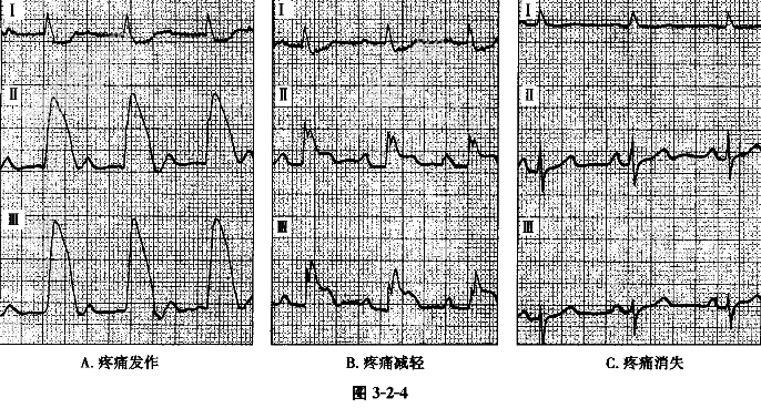 - 单项选择题患者,男, 46岁,反复发作胸痛3天, 胸痛持续数分钟,可自行缓解。此次就诊时再次发作胸痛, 胸痛发作到胸痛消失的心电图记录如图3-2-4所示,应诊断为