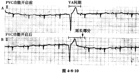 - 单项选择题图4-8-10显示起搏器PVC功能开启前、后的心电图。以下为有关PVC功能的描述,其中不正确的是
