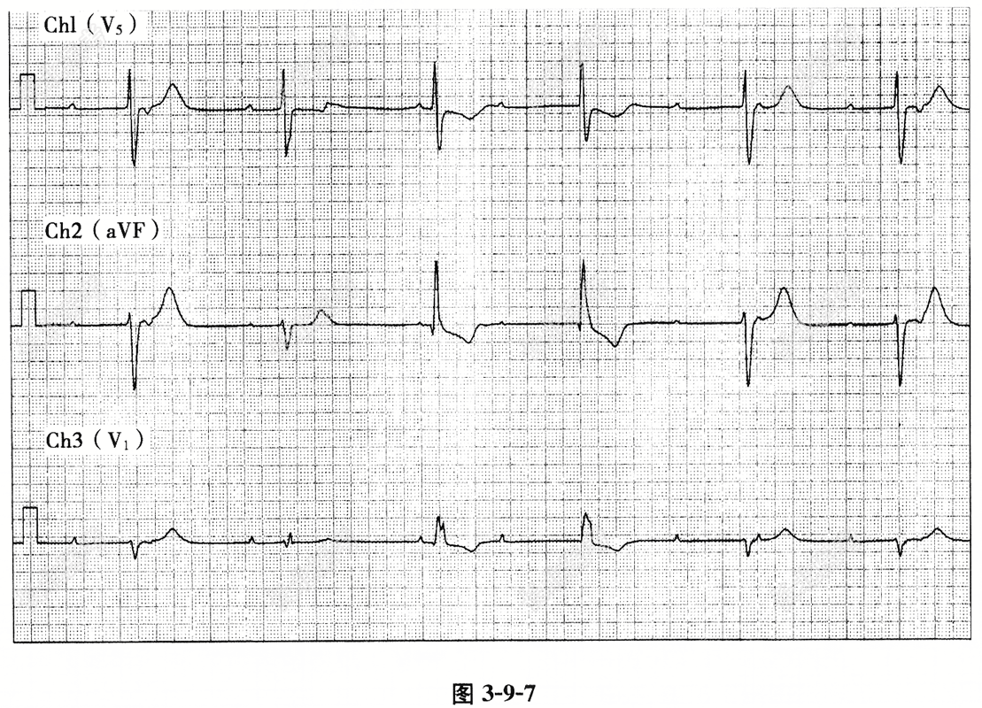 - 单项选择题患者,男, 63岁,因头晕、眼花伴乏力1年入院。心电图检查见图3-9-7(三通道监护导联同步记录), 正确的诊断为