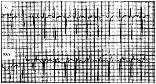 - 多项选择题2.行食管心房调搏检查,诱发出心动过速如图中所示(图中ESO为食管导联心电图), 应诊断为