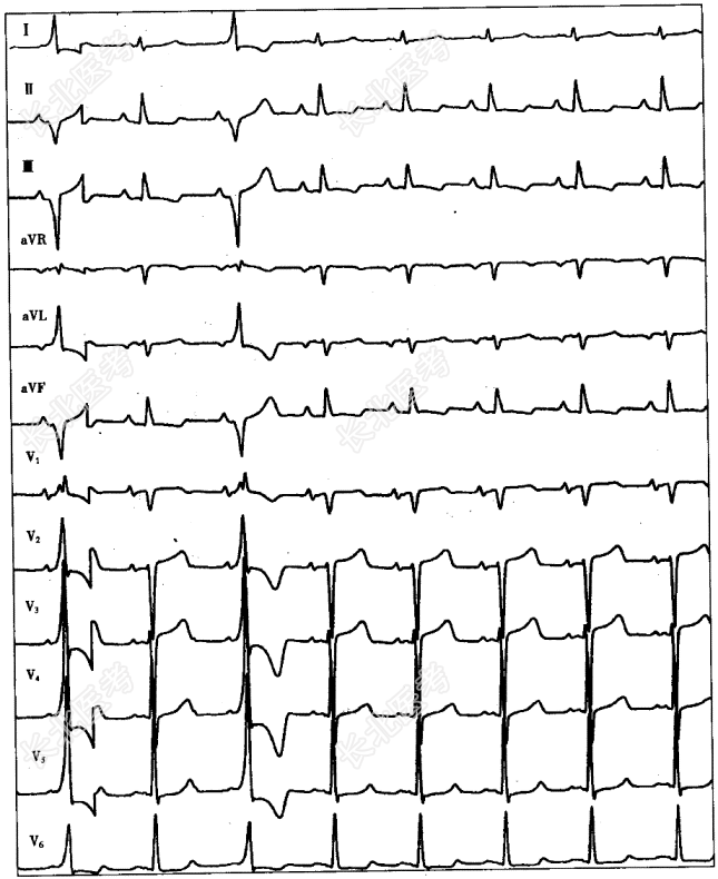 - [材料题] 患者女性,28岁,有心悸史。平时心电图如图中所示。