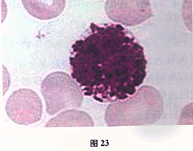 - 多项选择题2.镜检,某细胞如图23。体积10~12μm, 胞质内含紫黑色颗粒,颗粒量少、大小不均、排列杂乱。此为