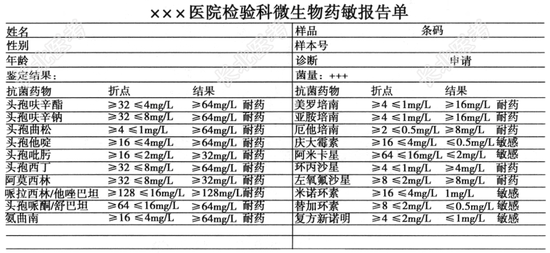 - 多项选择题3.患者入院后使用头孢他啶静脉治疗,未见明显好转, 1周后出现高热,血压降低, 考虑感染性休克。药敏结果如图所示,请问该病原体的耐药机制最主要是