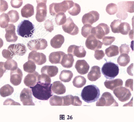- 多项选择题2.【提示】进一步检查血细胞分类形态,提示外周血淋巴细胞比例78%, 多数为小一中淋巴细胞,部分有细胞的毛刺样突起, 染色质比正常淋巴细胞略疏松,浆灰蓝或深蓝色, 有的有泡沫感(图26)。患者的诊断可能是