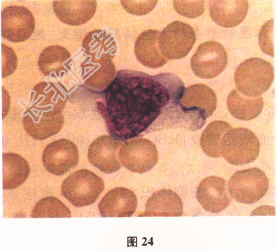 - 多项选择题1.镜检如图24,某细胞体积较大,外形不规则,胞质丰富,淡蓝色,有透明感,着色不均匀,边缘处蓝色较深呈裙边样。此为