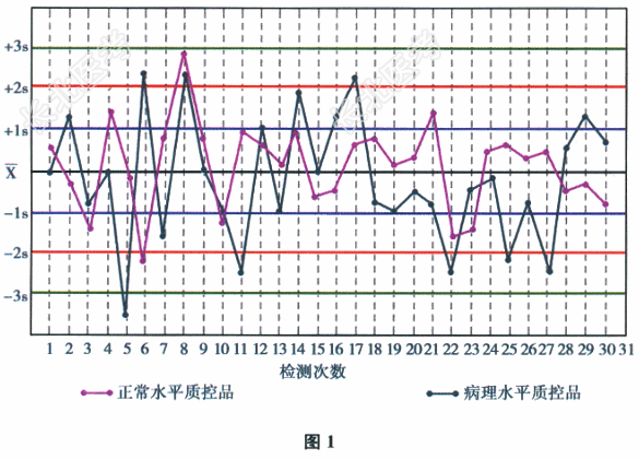 作为质控规则,每批测定的控制值个数为2,图1(见彩图)为该项目某月的室内质控图。
