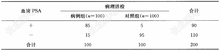 - [材料题] 某实验室以病理活检为诊断前列腺癌的金标准。现有前列腺癌病例组与对照组各100例,采用检测血清前列腺特异性抗原(PSA)的方法得到下列检测结果。