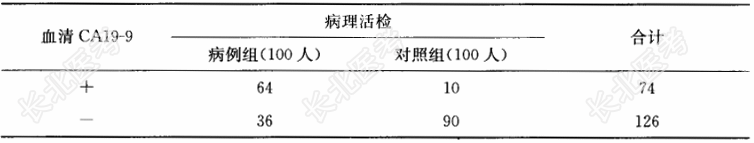某实验室以病理活检为诊断胰腺癌的"金标准",胰腺癌病例组与对照组各100例采用检测血清CA19-9的方法得到下列诊断结果。