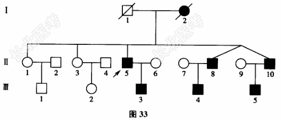 - [材料题] 患者男性,32岁,临床表现为血浆TC和LDL-C水平增高、黄色瘤、角膜弓和早发型冠心病等症状,家属表现为类似症状,被诊断为"家族性高胆固醇血症",家系图如图33。