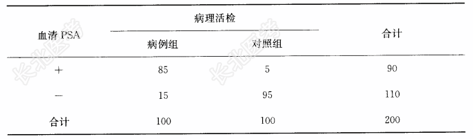 某实验室以病理活检为诊断前列腺癌的金标准。现有前列腺癌病例组与对照组各100例,采用检测血清前列腺特异性抗原(PSA)的方法得到下列检测结果。