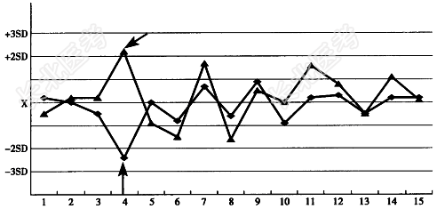 - 单项选择题以2种浓度的质控物对某检验项目进行室内质控时,下列图形中箭头所指的"点"违背Westgard多规则质控方法质控规则中的