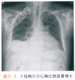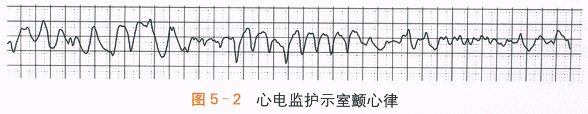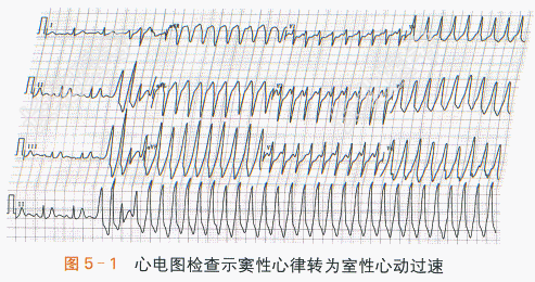 现病史患者,女性,57岁,因“反复胸闷、气促4年,突发意识丧失1次,心肺复苏后1周”入院。患者4年前因劳累、受凉等诱因出现胸闷、气促伴低热,予抗感染及退热治疗,症状无缓解,夜间平卧位尤感气短不适,遂于我院就诊。X线胸片检查示心影增大,肺水肿;心电图检查示窦性心动过速。cTnT3.28ng/ml,NT-proBNP32122pg/ml。经胸超声心动图检查示:左房室扩大伴左室整体收缩活动普遍减弱,左心室射血分数(LVEF)27%,轻度二尖瓣反流,轻度肺动脉高压。曾行冠脉造影结果正常,结合病史考虑扩张型心肌病,急性左心衰竭,予以利尿、改善心肌重构、降低心肌负荷等治疗后症状改善出院。出院后患者间断出现劳累后气促症状,体力活动有所下降。1周前患者突发心悸,伴头晕、黑矇症状,于我院急诊行心电图检查示:室性心动过速,心室率210次/min(见图5-1),予胺碘酮0.15g缓慢静注,继以1mg/min速度缓慢滴注,未能恢复窦性心律。随即患者出现意识丧失,四肢抽搐,伴大汗淋漓,心电监护示心室颤动(见图5-2),立即予胸外按压,电除颤(双相200J)一次,除颤成功,恢复窦性节律,意识清晰后收入院。既往史:患者10余年前上呼吸道感染后出现发热、咳嗽等症状,于外院治疗后呼吸道症状缓解,但仍存在心悸、胸闷症状,外院考虑“病毒性心肌炎”诊断。无冠心病、风湿性心脏病、高血压病、糖尿病等病史。体格检查:T37.2℃,P90次/min,R20次/min,BP102mmHg/66mmHg。神志清,半卧位,精神欠佳,颈静脉充盈,甲状腺未及肿大。胸前区可见皮肤灼伤痕迹。双肺呼吸音粗,双下肺可及湿啰音。心尖区及抬举样搏动,心界向左扩大,HR90次/min,律齐,心音低钝,心尖区可及第三心音和Ⅱ级收缩期杂音。腹软,无压痛,肝脾肋下未及,双下肢轻度水肿。实验室和影像学检查:血、尿、粪常规检查均正常:ALT42IU/L,AST 37IU/L,Scr124μmol/L,K⁺4.1mmol/L;葡萄糖6.7mmol/L;TC5.55mmol/L,TG0.90mmol/L,HDL-C0.79mmol/L,LDL-C4.35mmol/L;cTnT0.165ng/ml,NT-proBNP22936.0pg/ml,CK47IU/L,CK-MB17IU/L,CK-MM30IU/L;甲状腺功能正常;出凝血功能正常,D-二聚体0.47mg/L。入院心电图检查:窦性心律。胸部X线检查:右下肺少许慢性炎症,心影增大(见图5-3)。经胸超声心动图检查:全心扩大伴左室整体收缩活动减弱,LVEF32%,中度二尖瓣反流,中度肺动脉高压伴轻-中度三尖瓣反流。