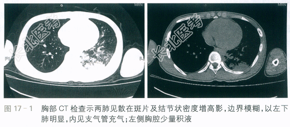 70.0mmHg。肝肾功能及电解质:基本正常。D-二聚体:0.49mg/L。心脏标志物:正常。肿瘤标志物及自身抗体:均为阴性。肺炎支原体抗体IgG≥1:320,IgM≥1:320。真菌葡聚糖检测(G试验):阴性。血培养:阴性。胸部CT检查:两肺炎症,以左下肺明显,左侧胸腔少量积液(见图17-1)。