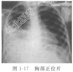 /L,N% 70.1%,L% 19.4%。口服双黄连口服液及解热镇痛片后,胸痛逐渐减轻,但体温仍未恢复正常,胸闷较前加重,遂就诊我院。查体:消瘦体型,右侧语音震颤减弱,右侧呼吸音减弱,心脏、腹部体检无异常。门诊胸部X线片(图1-17)示右侧胸腔积液,血沉70mm/h,PPD试验(+++),拟“胸腔积液”收入科。入院初步诊断:右侧胸腔积液(原因待查)。