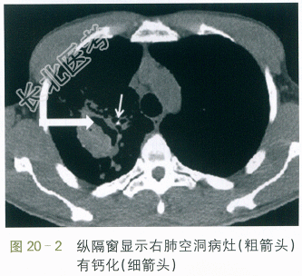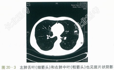 CT检查:右上肺见空洞,空洞内壁无液平,外周见斑片状影,纵隔窗显示空洞病灶有局限性钙化,左肺舌叶见小斑片状影伴支气管气象,右肺中叶也见少许渗出影伴小叶中心结节有树芽征。考虑两肺炎症,结核不能除外。如图20-1、图20-2、图20-3所示。