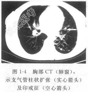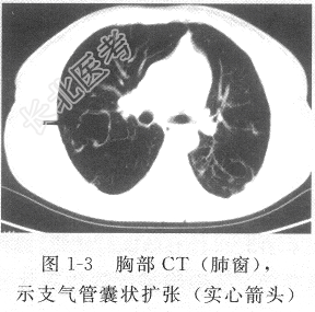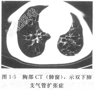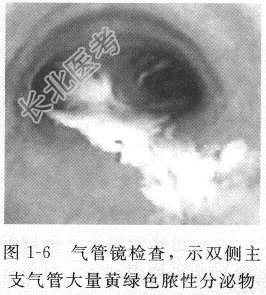 中年男性,长期吸烟史,十余年前反复出现咳嗽、咳大量黄绿色脓痰,痰量最大时可达200ml/d,多次至当地医院予静脉抗感染治疗后症状缓解。1周前再发上述症状,每日痰量80~120ml,同时出现发热、咯血,体温最高39.5℃,无畏寒、寒战,咯血量5~6口/日,总量约15ml,无头晕、乏力,无胸闷、胸痛,无呼吸困难,无盗汗、消瘦。否认高血压病、糖尿病史,否认百日咳、肺结核、支气管哮喘等。入院后血沉98mm/h,C反应蛋白112mg/L,降钙素原0.72μg/L,血气分析(未吸氧)提示Ⅱ型呼吸衰竭[pH 7.38,动脉血氧分压(PaO₂)58mmHg,动脉血二氧化碳分压(PaCO₂)52mmHg,SaO₂92%],胸部CT(图1-3~图1-5),气管镜检查(图1-6)提示双侧支气管炎性改变,肺功能提示中度阻塞性通气功能障碍。