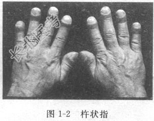 患者男性,40岁,因“反复咳嗽、咳痰十余年,加重伴发热、咯血1周”入院。门诊血常规示白细胞(WBC)15×10⁹/L,中性粒细胞百分比(N%)83.4%,血红蛋白(Hb)85g/L,胸部X线片(图1-1)示双肺纹理增多、紊乱,双肺可见多个不规则环状透亮阴影。查体:贫血貌,口唇发绀,杵状指(图1-2),无颈静脉怒张,双肺呼吸音粗,双下肺可闻及吸气相湿啰音,未闻及干啰音及哮鸣音,心浊音界无扩大,心率85次/分,律齐,未闻及病理性杂音,双下肢不肿。患者吸烟20年,400年支。入院诊断:支气管扩张症。
