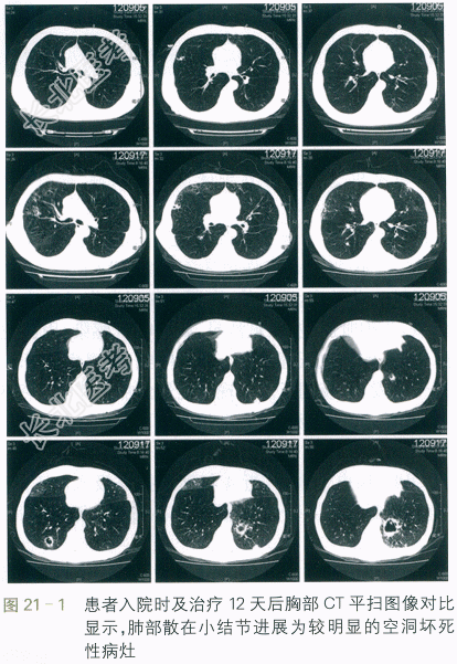62mmHg。cTnT在正常范围,BNP670ng/L。入院当天胸部CT(见图21-1)提示双肺肺气肿表现,两肺少许散在结节样病灶,考虑炎性病灶可能大。心超提示肺动脉收缩压38mmHg,其余无明显异常。