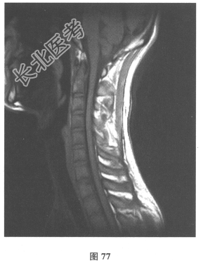 颅脑MRI:无异常。血清AQP-4抗体(-),脑脊液OB(+),各种自身抗体测定均阴性。VEP:右眼P100潜伏期延长。患者3年前无明显诱因出现双下肢麻木无力,伴有大小便障碍,脊髓MRI显示髓内长T₂信号影,见图76、图77。)此患者的诊断考虑