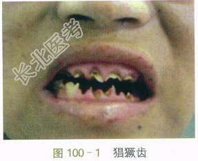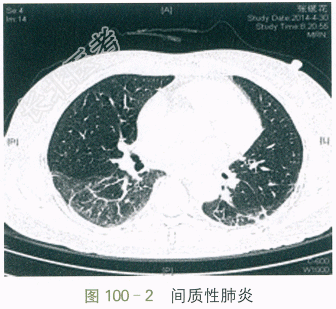 患者,女性,59岁。因“口干眼干5年,伴胸闷气促2个月”入院。患者5年前起出现口干,进食干性食物时需饮水方可咽下,伴有双眼干涩、泪少,未予特别重视,3年前出现牙齿逐渐变黑,继而小片状脱落(见图100-1)。2个月前出现咳嗽、咳白痰,至当地医院治疗后一过性好转,但不久即出现活动后胸闷气促,上两层楼即感明显胸闷气促、呼吸困难,休息后稍好转,同时伴四肢及双手掌指关节酸痛。近日胸闷气促加重,休息状态下亦感胸闷。病程中无头晕头痛、无畏寒发热、无雷诺现象、无皮疹及光敏、无关节晨僵、无反复腮腺肿大。患者神志清,精神可,食纳夜眠可,二便正常,体重无明显减轻。高血压史14年,自服珍菊降压片1片bid,平素血压控制在120mmHg/80mmHg左右。否认糖尿病,冠心病史。否认病毒性肝炎及结核病史。否认药物过敏史。体格检查:T37℃,P76次/min,R18次/min,BP120mmHg/80mmHg。全身浅表淋巴结未及肿大,无皮疹及皮下结节。口腔可见多发龋齿,舌面光滑。两下肺可及Velcro啰音,心界不大,各心脏瓣膜区未及杂音。腹平软,肝脾肋下未及,双下肢无水肿。四肢各关节未及肿胀,压痛(-)。自身抗体:抗核抗体1:320,抗SSA抗体阳性,抗SSB抗体阳性,抗线粒体抗体阳性,抗ds-DNA抗体15.4IU/ml,抗核小体抗体2.0RU/ml。免疫球蛋白:IgG20.29g/L,IgA4.66g/L,IgM1.13g/L,IgE211.0IU/ml。血常规:RBC 4.75×10¹²/L,Hb 130g/L,WBC 7.06×10⁹/L,PLT 298×10⁹/L;ESR51mm/h;hs-CRP7.6mg/L。补体:C31.33g/L,C40.23g/L。血气分析:pH7.45,PaCO₂38.0mmHg,PaO₂65.0mmHg,SaO₂93.0%;乙肝免疫标志物、丙肝抗体、HIV抗体全阴性。肺HRCT:两肺间质性炎症(见图100-2)。腹部B超:肝脂肪浸润。心超:未见异常。肺功能:中度限制性通气功能障碍。
