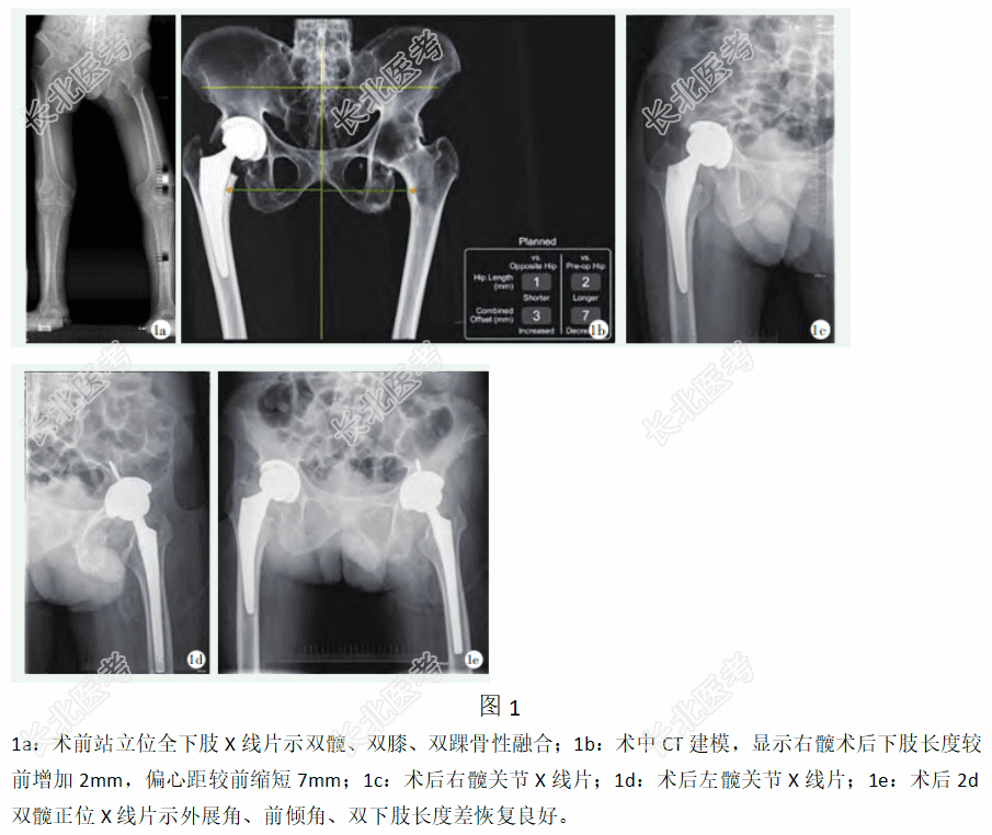 术后24h内头孢预防感染,抗凝、消肿止痛等对症处理,术后第1d助行器辅助下床适量活动。术后2dX线片示右侧和左侧,髋臼外展角为46°、42°;前倾角为17°、12°。右侧和左侧,小转子至坐骨结节连线距离术前为40mm、25mm;术后为41mm、34mm;双下肢长度术前相差15mm,术后7mm(图1c~1e)。术后6个月双髋关节屈伸活动度显著改善。在助行器辅助下行走术前10m,术后500m,术后切口愈合佳,无假体松动、血栓形成等并发症。VAS评分0分;Harris评分术前42分,术后64分;OHS评分术前41分,术后36分。