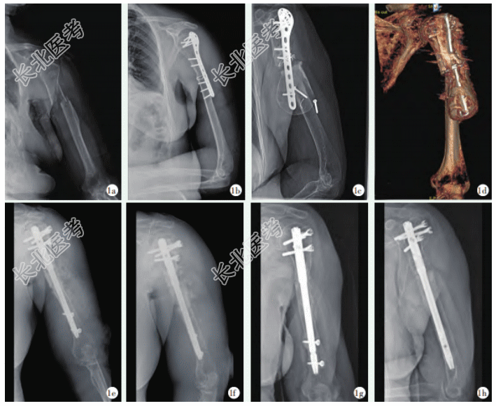 - [材料题] 患者女性,80岁,因“左上臂骨折术后9年,畸形、疼痛活动受限5年”为主诉入院。体格检查:患者左上臂中上段可见向前、向外突出畸形,周围可见多处陈旧性手术瘢痕,无明显渗出,左上肢肌肉萎缩明显,左上肢较右上肢短缩约2cm。左上臂中上段处压痛明显,压痛处可触及8cm×4cm肿物,质地硬,推之不移,未触及骨擦感及异常活动。左桡动脉搏动良好,左手各指血运、皮肤感觉及活动良好,未见垂腕、爪形手、猿手等异常症状,余肢体查体未见明显异常。患者既往因外伤致左肱骨干骨折,术前X线片示骨折类型为12-C型(图1a),在当地医疗机构行左肱骨骨折钢板内固定术+钢丝捆扎术。第1次术后X线片检查提示:左侧肱骨上段骨折内固定术后内固定器松脱、骨髓腔内密度增高(图1b);术后8年复查X线片均提示固定器松脱、骨折远端囊袋状异常密度影进行性增大、骨折断端无愈合倾向(图1c)。术后8年CT三维重建提示:左侧肱骨上段骨折内固定术后,骨折不愈合,金属内固定器下端松脱、左肱骨骨折远端前外侧囊袋状异常密度影(图1d)。患者多年来反复出现左上臂疼痛,左肩关节活动受限,近1年来上述症状再发加重,严重影响日常生活,于2022年8月以左肱骨骨不连收治于本院创伤骨科。结合病史、影像学及查体,符合左肱骨骨折术后骨不连并巨大包壳形成诊断,具备手术治疗指征。