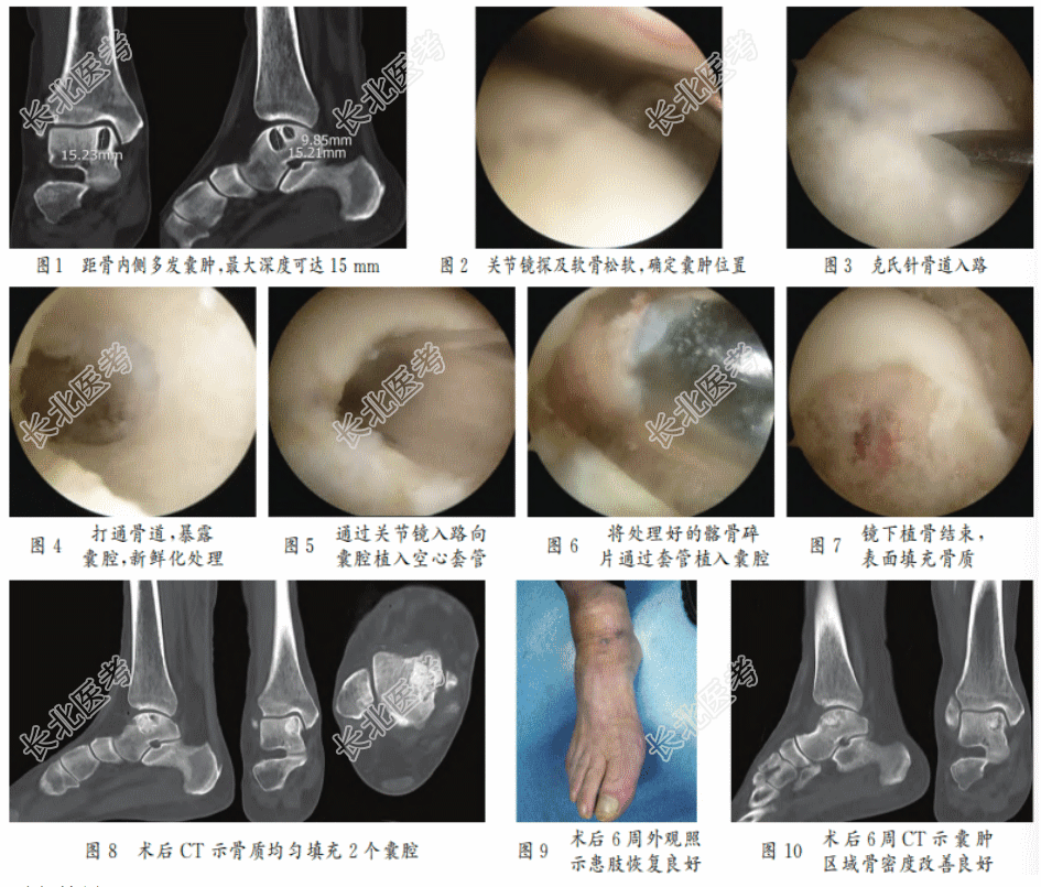 患者麻醉后取仰卧位,右下肢捆扎止血带,右侧髂骨术区及右下肢常规消毒、铺巾/单、覆被,贴护皮膜。延同侧髂嵴做长约5cm切口,逐层切开皮肤、皮下组织,骨膜下剥离,显露髂骨,骨凿凿下大小合适的骨柱并碎片化处理备用,逐层缝合,刀口加压包扎。右下肢驱血后,建立右踝关节前内、前外、前侧关节镜通道,依次探查见踝关节内滑膜增生,距骨前内侧局灶性软骨剥脱,大小约12mm×14mm,软骨损伤区域予以微骨折术处理。以刨刀及射频消融器清理增生的滑膜,局部新鲜化处理后,用探钩确定囊肿位置(见图2)。用克氏针于距骨前内侧穿入暴露囊腔(见图3),可见淡黄色液体流出,扩大骨道后,用刮匙、刨刀清理内侧囊壁,克氏针穿刺囊腔硬化骨壁使之新鲜化(见图4)。将处理好的髂骨碎片经套管植入囊腔并压实平齐周缘骨质(见图5~7)。去除止血带,患者肢端血运良好,置入1根引流管,无菌敷料包扎,术毕。术后CT示囊腔被植骨填充(见图8)。术后6周随访患肢恢复良好(见图9),活动范围跖曲30°、背伸25°、内翻25°、外翻25°,AOFAS评分66分,复查CT示囊肿区域骨密度改善、恢复良好(见图10)。