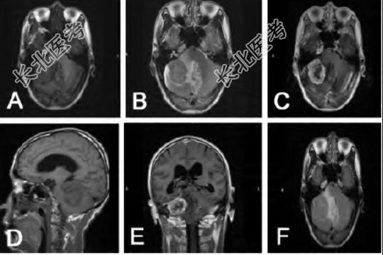 患者,男,68岁,因头晕头痛伴行走不稳1个月入院。既往2年前曾行胰腺肿瘤切除术,术后病理检查示低分化胰头腺癌,术后病情稳定,按期入院接受随访,同时给予“卡培他滨+吉西他滨”化疗,未见明显异常。入院时体格检查:神志清楚,GCS评分15分;双侧瞳孔等大、等圆,直径约2.5 mm,对光反射灵敏;颈软,无抵抗;听力正常;四肢肌力5级,肌张力正常;指鼻试验阳性,轮替试验阳性,跟膝胫试验阳性,双下肢病理征未引出。外院颅脑CT示右侧桥小脑角区边界清晰类圆形肿块,等稍高密度,周围可见不规则水肿带环绕。入院后颅脑MRI平扫及增强显示右侧桥小脑角区团片状病灶,信号欠均匀,呈等T1、稍长T2混杂信号;T2 Flair呈混杂等高信号,内可见片状地信号灶,病灶可见分叶,边界清晰,呈宽底与邻近脑膜关系密切;增强后可见周围脑膜明显强化,最大层面约4.2 cm×3.6 cm×2.7 cm,可见明显脑膜尾征。术中见肿瘤组织呈灰色,无明显包膜,质地较脆,与天幕轻度粘连,基本切除病灶。术后病理检查考虑转移瘤。