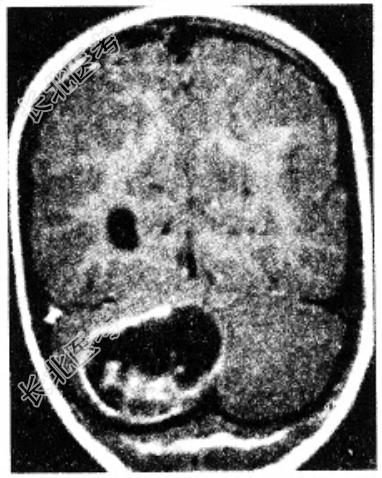 男性患者,39岁。头痛、步态不稳3个月。查体:神清,双侧视盘水肿,右侧轮替动作不能。周围血象红细胞增多,B超发现右肾有一囊性肿物,头颅CT发现右小脑半球囊性占位性病变(如图所示)。