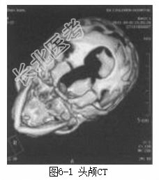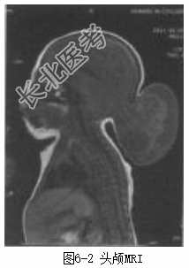 患儿男性,1月龄。因“出生后发现枕部肿物1个月”入院。患儿出生后家长即发现其枕部有一肿物,约“核桃”太小,随患儿生长,肿物逐渐增大,家长发现患儿哭闹对肿物可略增大,安静睡眠时又略缩小,至今无破溃、流液。发病以来,患儿食欲好,大小便正常,不伴有呕吐、肢体抽搐等情况。体格检查T37℃,R36次/min,P116次/min,BP78/神志清楚,头围40cm,前囟平软,枕部中线处可见一大小约5cm×5cm×4cm的肿物,表面无毛发生长,质软,囊性感,无压痛。双眼球活动灵活,双鼻唇沟对称,颈部无抵抗。心、肺、腹未见明显异常体活四肢肌力4级、肌张力正常。生理反射存在,病理征阴性。辅助检查头颅CT(图6-1)示枕骨局部缺损,枕部脑膨出;头颅MRI(图6-2)示枕部脑膜脑膨出。