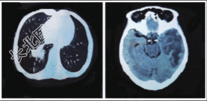患者,女,63岁,农民。因“咳嗽、咳痰4个月,发现肺部、颅内占位1月余”入院。患者被家人发现不能言语,答非所问,于当地医院就诊。头颅+胸部CT:左侧额叶转移瘤伴水肿可能大,右肺下叶阻塞性肺炎,左肺下叶占位;两肺多发陈旧灶。PET-CT示左侧颞叶不规则环形稍高密度影,SUV最大值11.9,右肺下叶见3.9cm×3.0cm分叶状团块影,SUV最大值9.3,考虑右下肺癌伴右肺转移、肺下叶阻塞性炎症,右肺门淋巴结转移,左颞叶脑转移。脱水改善脑水肿治疗后,失语情况明显改善。