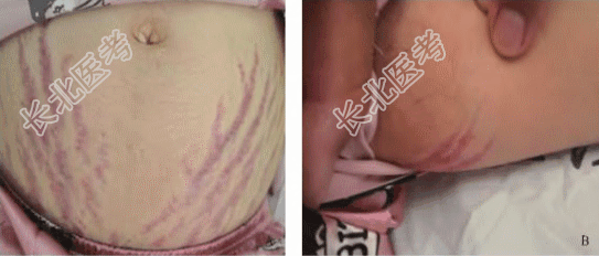 患者,女,33岁。因“孕20周,颜面及双下肢浮肿近50天,发现肾上腺包块5天”就诊。3个月前诊断为“亚临床甲减,桥本甲状腺炎”,现口服优甲乐75μg/d治疗,甲状腺功能正常。近50d来颜面及下肢浮肿、体重增加明显。既往无高血压、高血糖病史;孕前无面部及下肢浮肿、无腹部紫纹及肥胖等体征。体格检查:血压132/82mmHg;无水牛背,无锁骨上脂肪垫;腹部膨隆,下腹壁、双腋下及大腿内侧可见紫纹(图1);颜面、下肢凹陷性水肿。超声检查:左肾上腺区4cm大小包块。