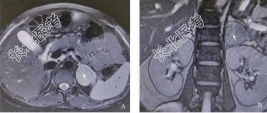 辅助检查:血皮质醇(8:00am)1537nmol/L、血皮质醇(16:00pm)1505nmol/L,昼夜节律消失;1mg地塞米松抑制试验后血皮质醇(8:00am)1544nmol/L,不能被抑制。血促肾上腺皮质激素(ACTH)(8:00am)1.0pg/ml、ACTH(16:00pm)1.0pg/ml。空腹血糖3.91mmol/L、餐后2h血糖6.1mmol/L。血钾2.95mmol/L、血钠139.6mmol/L、血氯101.3mmol/L。血常规:白细胞6.8×10⁹/L、红细胞3.53×10¹²/L、血红蛋白114g/L、血小板96×10⁹/L。影像学检查:磁共振成像(MRI)示左侧肾上腺区可见3.9cm×4.3cm×4.6cmT1WI等信号、T2WI欠均匀占位(图2);垂体Rathke’s囊肿。