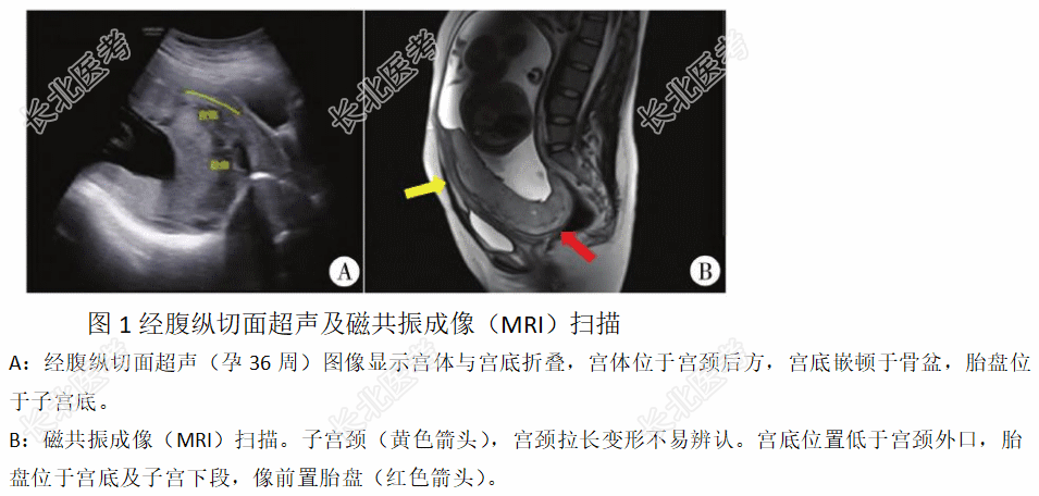- [材料题] 患者,女,30岁,G1P0,因“停经37周,超声发现完全性前置胎盘”收入院。患者产检过程顺利,无不适。2年前曾行腹式子宫肌瘤剔除术+肠粘连松解术,1年前曾行右侧卵巢囊肿穿刺术。孕中期超声提示,膀胱与子宫之间可见长而细的宫颈,宫底远低于宫颈外口水平(图1a)。孕晚期核磁共振提示,子宫前壁呈囊状,宫底位置低于宫颈外口,子宫明显后倾后屈,宫颈拉长变形不易辨认(图1B)。于2022年12月20日行剖宫产术,取下腹正中直切口,发现子宫形态异常,经增厚增宽的阔韧带于子宫后壁体部切口娩出胎儿,顺利娩出胎儿及胎盘。发现狭长的宫颈位于右侧阔韧带切口边缘,宫颈部分损伤予缝合,宫颈管放置引流管;子宫前壁下段位于宫体右上方,并向后向下反折,宫底位于盆底,宫底部与盆底广泛粘连紧密,子宫无法复位。术后顺利,拔出宫颈引流管,患者恢复良好,月经来潮。