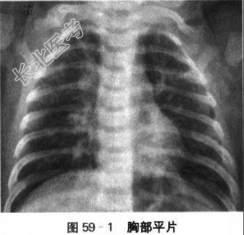 患儿,男,10月,因"咳嗽5d伴喘息2d"入院。患儿5d前因接触"感冒"家长,出现流涕、鼻塞、咳嗽。流涕、鼻塞好转,咳嗽逐渐加重,伴有痰鸣。2d前,咳嗽时伴有喘息,以活动及清晨咳嗽阵发性加剧时更为明显。病初2d有发热,38℃左右,未予以处理,自行退热。病程中无明显呕吐、腹痛、腹泻,无明显气促、呼吸困难,无尿时哭吵,无惊厥等。精神、胃纳可,睡眠欠佳。曾予以口服抗生素、止咳治疗,疗效不佳。患儿为G₁P₁,孕40周自然分娩。BW3250g。出生Apgar评分10分。否认母亲孕期感染或服药史,及围产期窒息缺氧病史。否认家族传染病和遗传病史。生后母乳喂养,2月开始面部有湿疹,局部用药已明显好转。6月能坐,9月萌牙2颗。体格检查:T37.6℃,P140次/min,R40次/min,BP78mmHg/46mmHg,Wt9.0kg。神清,精神可,巩膜无黄染,皮肤无瘀点、瘀斑,前囟1.5cm×1.5cm,平,颈部软。气管居中,无明显鼻翼煽动、吸凹征、口唇发绀。HR140次/min,律齐。两肺音粗,可及痰鸣音和哮鸣音。腹部平软,肝脏肋下1.5cm,质地软,脾未及。双下肢无水肿。SaO₂94%。实验室检查:(1)血常规检查:Hb118g/L,WBC6.8×10⁹/L,N45.1%,LY48.1%,PLT167×10⁹/L,CRP10mg/L。(2)病原学检查:呼吸道合胞病毒(+),呼吸道流感、副流感、腺病毒、军团菌等均为阴性;MP-IgM(-)、MP-IgG(-),CP-IgM(-);RSV(+);呼吸道分泌物细菌培养(-)。 (3)胸部X线检查:两肺纹理增多、紊乱,内中带见少许点片状影,左下肺轻度气肿改变(见图59-1)。(4)肺功能检查:患儿潮气呼吸功能异常,存在中度阻塞性病变。