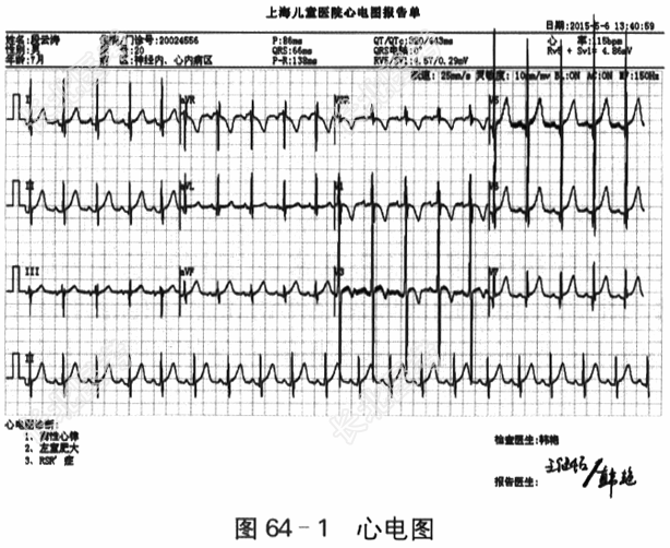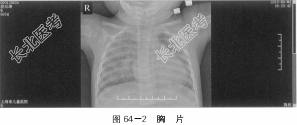 患儿,男,7个月,因"发现心脏杂音5月余"就诊。患儿5月余前因咳嗽至当地医院就诊,诊断为"支气管肺炎",同时体格检查后发现心脏杂音,行心脏彩超检查示动脉导管未闭(具体不详)。后于当地市级医院门诊查心超:动脉导管未闭,管型,内径(0.5cm),长径(0.7cm),左向右分流,卵圆孔末闭(0.4cm),三尖瓣轻度关闭不全,未予特殊治疗。患儿平时体质一般,易呛奶,吃奶间停伴汗多等,安静时易出汗,无面色发绀等不适。今来我院心超检查:动脉导管未闭(0.3cm),卵圆孔未闭(0.2cm),肺动脉血流快。为进一步治疗,今拟"先天性心脏病,动脉导管未闭"收住入院。病程中无明显青紫症状。大小便正常。患儿为G₂P₂,足月剖宫产。BW4000g。母亲孕期有感冒史,孕3~4月时诊断为胎盘前置。否认围产期窒息缺氧病史。否认家族心脏病或其他遗传病史。出生至今有3次肺炎病史。体格检查:T37.4℃,P124次/min,R30次/min,Ht67cm,Wt8kg,BP76mmHg/44mmHg。神清,呼吸平稳,反应可,无青紫及杵状指。股动脉可听及枪击音。双肺呼吸音粗,未闻及明显啰音。心音有力,HR124次/min,律齐,胸骨左缘2~3肋间可闻及Ⅲ/6级连续性杂音,P2稍亢,未及震颤,无传导。腹软,肝肋下1cm,脾肋下未及。四肢肌力、肌张力正常。双下肢无水肿。实验室检查:(1)心电图检查:①窦性心律;②左室肥大;③RSR症(见图64-1)。(2)X线胸片检查:胸廓对称,两肺纹增多,两肺野内中带见少量斑片样密度增高模糊灶,边缘模糊不清。两侧肺门影不大。纵隔无明显增宽,心影增大,心胸比率(CTR)58%,两膈面光整,肋膈角锐利。如图64-2所示。(3)超声心动图检查:心脏位置及连接正常。左房左室大。肺动脉增宽,血流2.7m/s,压力梯度(PG)30mmHg。二尖瓣轻微反流,三尖瓣轻度反流。卵圆孔未闭0.2cm,左向右分流。室间隔连续。左位主动脉弓。动脉导管开放,内径约0.33cm,左向右分流,分流速度5.3m/s,PG113mmHg。