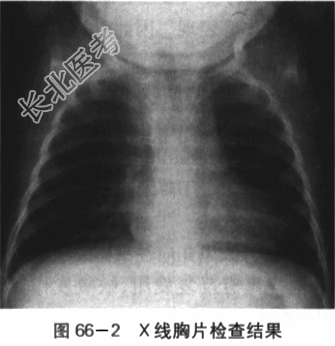 患儿,男,2岁3个月,因"哭吵后口唇发绀伴气促1h"就诊。患儿入院前1h剧烈哭吵后出现口唇发绀、呼吸急促、家属安抚后无明显改善,送入急诊。出生6月龄前患儿无特殊病史,6月龄后患儿偶有哭吵后口唇青紫,增有剧烈哭吵后呼吸快,口唇发紫加重,安抚后好转;在当地住院发现有心脏杂音,做了一些检查后诊断心脏病(具体不详)。平素活动量少,喜静不喜动,喜抱,偶尔有走路时反复下蹲。目前饭虽少,身高、体重均不及同龄儿。大小便正常。患儿为G₁P₁,孕39周自然分娩。BW3200g。否认孕期感染或服药史,否认围产期窒息缺氧病史。否认家族心脏病或其他遗传病史。体格检查:T37℃,P148次/min,R52次/min,BP78mnlHg/40mmHg,Wt10.1kg,Ht78cm,SaO₂68%。烦躁,全身大汗,口唇发绀,可见杵状指,四肢脉搏稍弱,对称。肺部检查两肺呼吸音粗稍粗,未及明显啰音。心前区饱满,心尖搏动位于第4肋间左乳线上,范围约2cm;HR118次/min,规则,2~3LSB SMⅠ~Ⅱ级,粗糙,P2略增强,无分裂。腹部平软,肝脏肋下2.5cm,质地软。脾未触及。双下肢无水肿。实验室检查(1)心电图检查:窦性节律,右房、右室增大。电轴右偏,Ⅱ导联P波高尖,呈双峰,时限=0.12s。V₁导联QRS波群呈R形,V₅导联QRS波群呈RS形;ST段压低,V₃~V₅导联T波倒置。如图66-1所示。(2)X线胸片检查:右房、右室大。心胸比例0.65,心影呈"靴型"心,心尖圆钝、上翘;肺动脉端内凹,肺血少。如图66-2所示。(3)超声心动图检查:心脏位置及连接正常。右房、右室增大,右室壁肥厚,左室收缩活动正常。主动脉增宽,骑跨于室间隔上50%。左右冠状动脉开口可见,肺动脉瓣及瓣下狭窄,瓣环0.67cm,总干内径1.29cm,流速2.3m/s,右室流出道狭窄肌肉肥厚,过此处血流少,流速约2.8m/s。左肺动脉开口0.82cm,内径0.97cm;右肺动脉开口10.78cm,内径0.85cm。房室瓣开放活动可。房间隔完整。室间隔缺损,对位不良型,双向分流。左位主动脉弓。如图66-3所示。