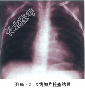 患儿,女,6d,因"纳差6d,面色青紫1d"就诊。患儿G₁P₂,孕37⁺²周,双胎之小,因双胎行剖宫产,生后APGAR评分不详,BW:2480g,生后配方乳喂养,吸吮乏力,纳差,哭声小。1d前家长发现患儿出现青紫,以口周为主,哭闹时及纳乳后明显,于当地医院行心脏彩超检查:先天性心脏病:肺动脉狭窄,动脉导管未闭,右室高压。为求一步诊治转入我院。病程中无发热,无抽搐,无呛奶,无呕吐,无腹泻。大小便正常。否认孕期感染或服药史,否认围产期窒息缺氧病史。否认家族心脏病或其他遗传病史。体格检查:T36.8℃,P165次/min,R56次/min,BP83mmHg/50mmHg,Wt2350kg。新生儿貌,神清,反应可,哭声弱,四肢脉搏对称。气急明显,肺部检查双肺呼吸音粗,未闻及明显干湿性啰音。心前区无隆起,心尖搏动位于第5肋间左乳线上,范围约1.5cm,HR165次/min,心律齐,胸骨左缘2~3肋间闻及Ⅲ~Ⅳ/6级收缩期杂音,肺动脉第2心音减弱,未闻及心包摩擦音。腹平软,无肌卫,未及包块。肝脾肋下未及。双下肢无水肿。四肢肌张力可,拥抱反射(+),觅食反射(+),吸吮反射(+),握持反射(+)。实验室检查: (1)心电图检查:①窦性心动过速;②右心房、右心室肥大;③Ⅰ呈QS;④心室内传导阻滞;⑤ST-T改变。如图65-1所示。(2)X线胸片检查:两侧肺野充血。心胸比例0.65,肺动脉段突出,主动脉结较小,可见双心房影,左心缘向左下延伸。如图65-2所示。(3)超声心动图检查:心脏位置及连接正常。右房右室明显增大,右室壁明显肥厚,主动脉无增宽,瓣膜开放活动正常。肺动脉瓣叶明显增厚,回声增强,开放活动明显受限,肺动脉瓣环9.5mm,总干及左肺动脉扩张,总干内径16.9mm,左肺动脉内径7.0mm,右肺动脉内径6.2mm。肺动脉过瓣流速4.94m/s,压差99,3mmHg。房室瓣膜开放活动正常。三尖瓣轻到中度反流,反流速度5.32m/s,压差113mmHg。卵圆孔未闭,右向左分流。室间隔完整。左位主动脉弓。未见动脉导管开放。未见明显冠状窦隙开放。少量心包积液:左室游离壁3.0mm。
