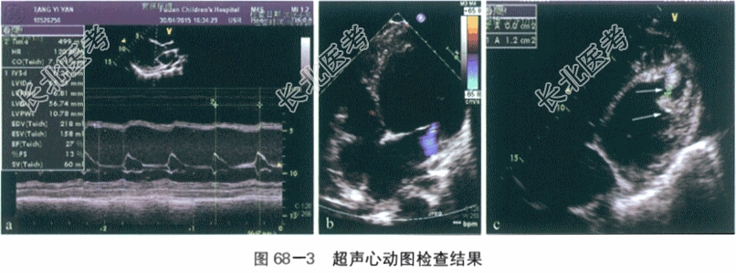 (3)超声心动图检查(2015年4月30号):心房正位,房-室连接、心室-大动脉连接正常。左心房内径35mm,左心室内径舒张末期(LVEDD)65mm,收缩末期(LVESD)56mm,主肺动脉内径27mm,主动脉根部内径18mm,室间隔与左室后壁均为6mm。全心增大,以左房、左室内径增大为著,心脏搏动明显减弱,LVEF=27%(见图68-3-a)。房间隔与室间隔完整。肺动脉增宽,肺动脉瓣轻度反流,主动脉瓣启闭正常;二、三尖瓣探及轻度反流(见图68-3-b),三尖瓣反流压差37mmHg,多普勒组织成像(DTI)测二、三尖瓣E/A均>1。左室心腔内紧心尖处探及两个中高回声团块,面积分别为2cm